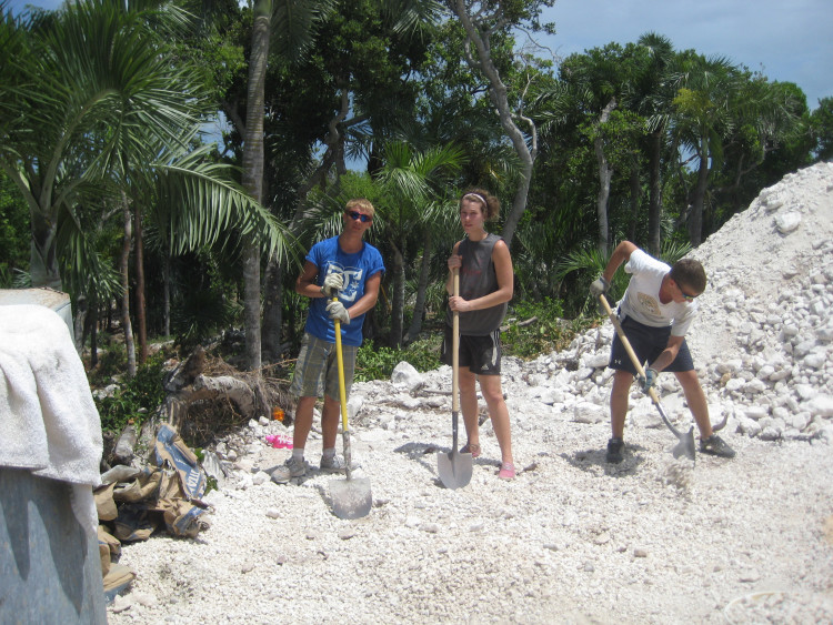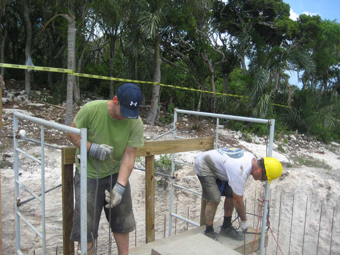 We’ve been working hard down here in the Bahamas. Yesterday we were up bright and early to get cement poured in the future water reservoir at Camp Bahamas. This was an intense project, folks. The pit for the reservoir was 16 feet deep, and the pour job was done with a drum mixer. Team members hauled rocks, sand, water, and cement powder to the drum, and then the mixed cement was wheeled over to our handmade chute, where other team members scraped the cement down to the bottom. More team members waited in the bottom of the pit to spread the cement evenly along the bottom. It was a long day, but the team felt really good that we could contribute to the camp in such a “concrete” way.