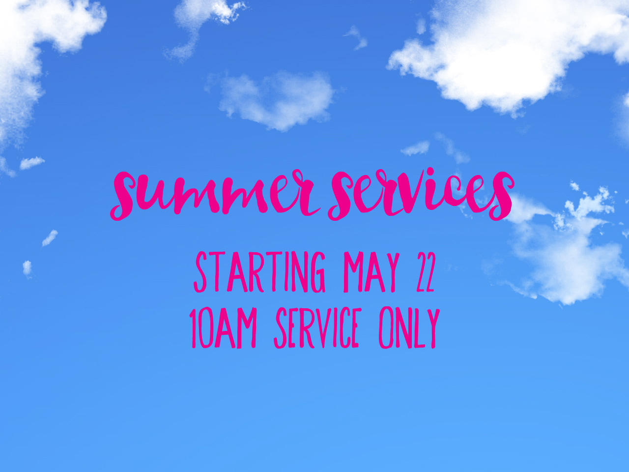 As our student population returns home from the universities and colleges that they have been attending here in Edmonton, it leaves a noticeable mark in our Sunday morning attendance. But this also provides for us the opportunity to move down to one service over the late spring and summer months, joining the people from both services into one. And it means that our worship teams don’t have quite as long a playing time each Sunday, and they appreciate that as well. We will be moving to one service on May 22, changing our service time each Sunday to 10:00 a.m.