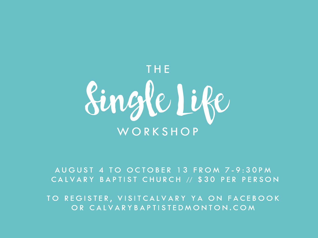 Calvary Baptist Church 7215 97 Street NW, Edmonton, AB, CanadaThe Single Life Workshop is coming to Calvary in August 2016! This ten week course is designed for you to discover how to more authentically connect to yourself, God, and others in simple and practical ways. This course is for anyone who is single/dating/engaged and has a desire to understand what healthy relationships of all kinds look like and how this begins with our own spiritual health. The info session will be held in-between services, upstairs in the youth room.